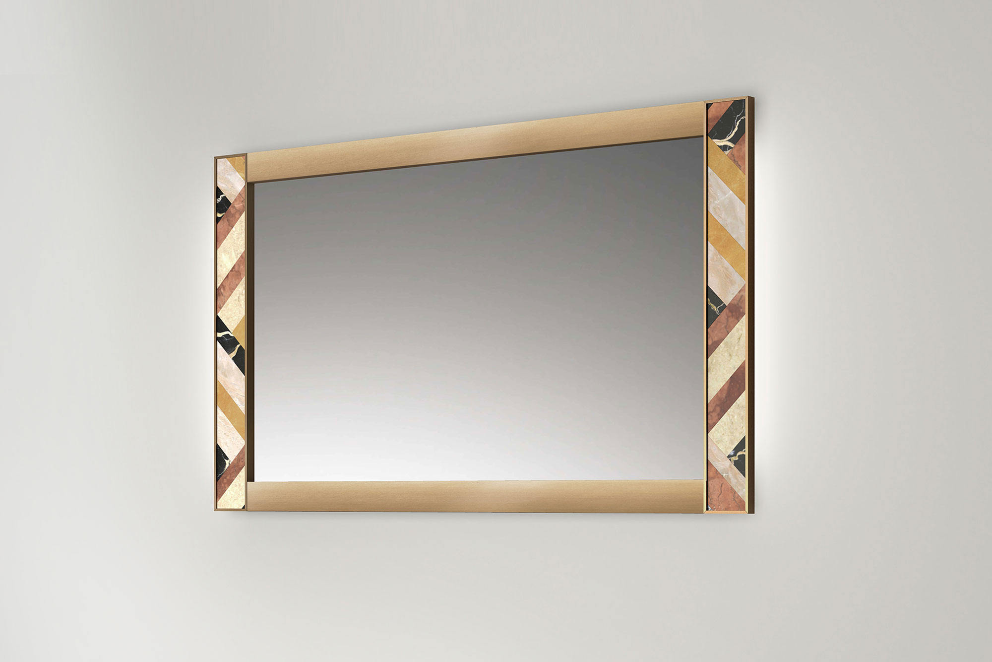 I marmi policromi intarsiati con un decoro geometrico esaltano il carattere grafico del modello Tarsia. Lo spunto nasce dai colori e dai materiali utilizzati negli ingressi dei palazzi storici milanesi: le tonalità garbate sono accostate tra loro attraverso un gioco di razionale bellezza. Il telaio in metallo con finitura bronzo, connette le due estremità laterali decorate, realizzando un’alternanza di equilibri e squilibri.